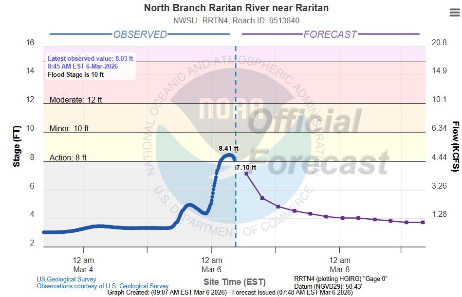 The North Branch Raritan River at South Branch reached 8.14 feet at 6 a.m. where the flood stage was 8 feet.