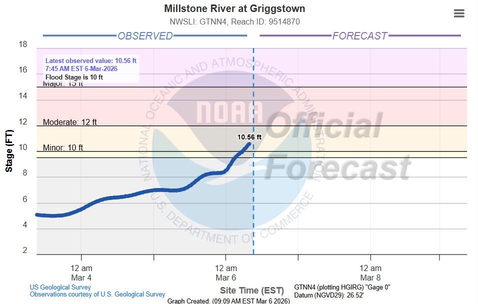 The Millstone River at Griggstown is at 10.56 feet as of 9 a.m. above the flood stage of 10 feet. And projections show the river will continue to rise.