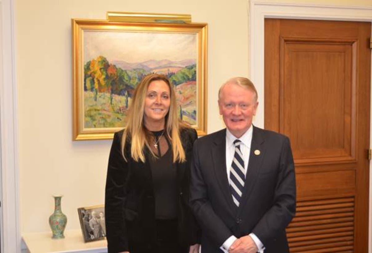 (Image via John Byers: Congressman Leonard Lance with Kim Van Note, Basilone’s niece and a leader in the Basilone Foundation.)
