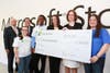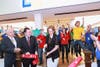 The Microsoft Store's grand opening started with a ribbon cutting ceremony at 9:30 a.m. on Saturday morning, when Microsoft corporate vice president Kathleen Hogan performed the cutting and presented a $1 million check to a local chapter of Junior Achievement for software grants.