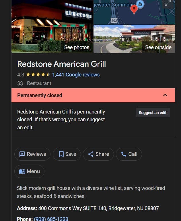 Multiple calls to Redstone's corporate office were not returned to Patch to confirm the closure. Bridgewater Commons told Patch they were looking to confirm the permanent closure.
