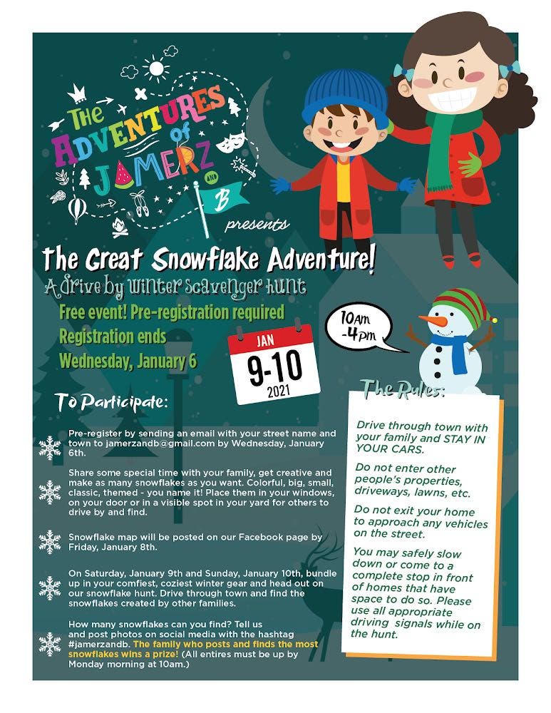 A snowflake map will then be posted on The Adventures Of Jamerz And B by Friday, Jan. 8. Then families can drive around the towns to hunt for snowflakes. Families will then send photos of each snowflake they find on social media using the hashtag #jamerzandb. The family who posts and finds the most snowflakes wins a prize.