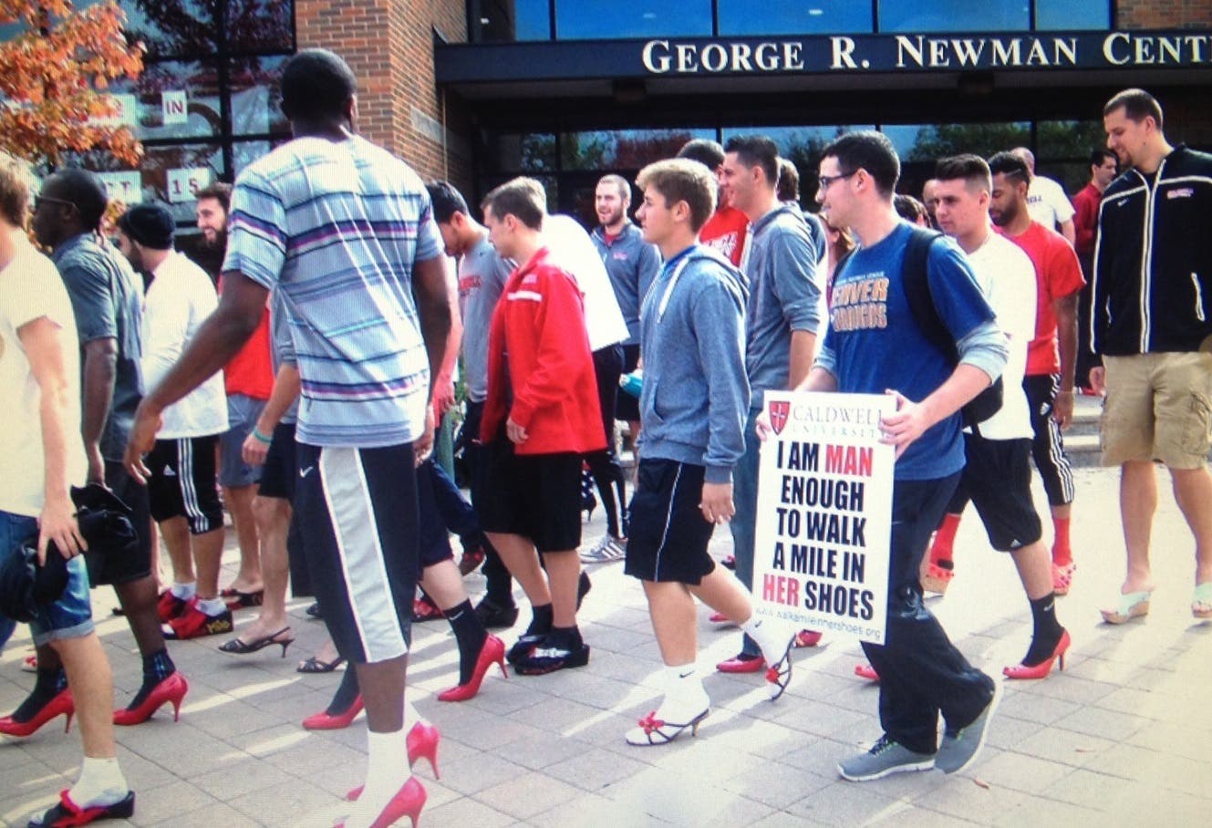 According to a release, on October 15, 2014, nearly 100 male Caldwell University student-athletes and staff members donned women’s high-heeled shoes Wednesday afternoon and walked around campus as a part of Walk a Mile in Her Shoes.