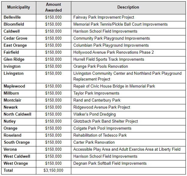 A full list of the chosen projects and awards follows below. Essex Fells didn’t submit an application for funding, officials noted.