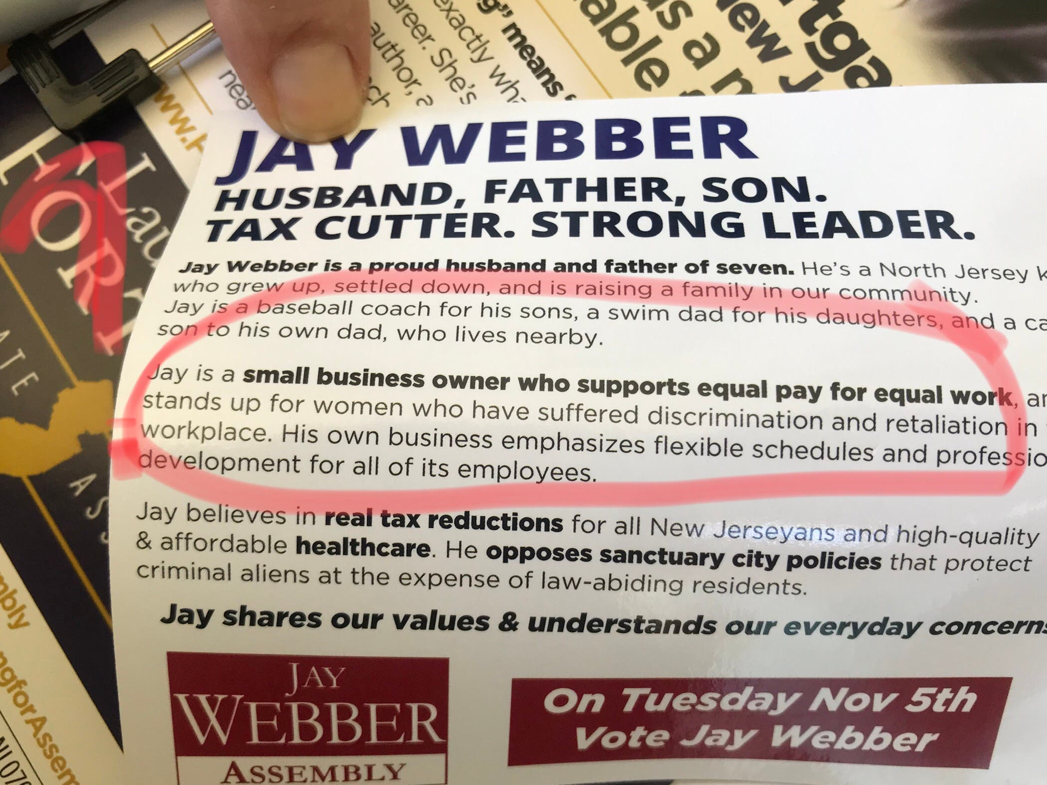 “As a small business owner and full-time working mother who has always shared equally with my husband the responsibility of financially supporting our family, I find Assemblyman Webber’s false and deceitful claims on his campaign literature that he supports equal pay for women deeply offensive, as should working women and working mothers across New Jersey,” she said.