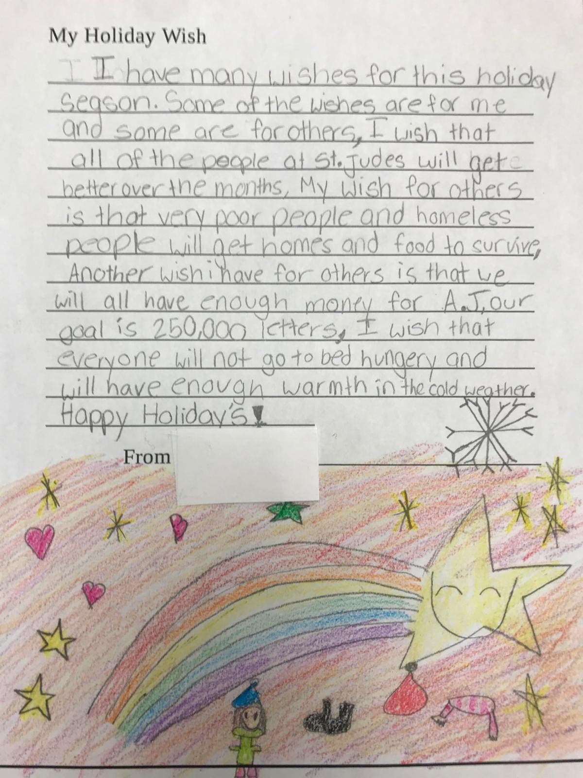 The students’ letters included several inspiring messages, such as: “My wish for others is that very poor people and homeless people will get homes and food to survive.”
