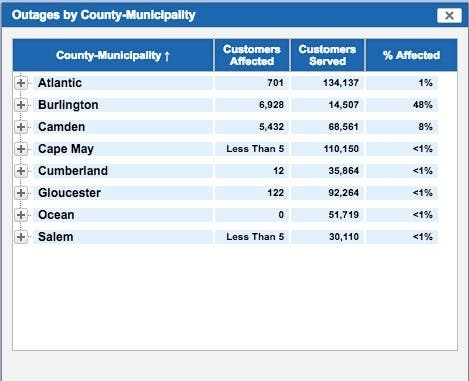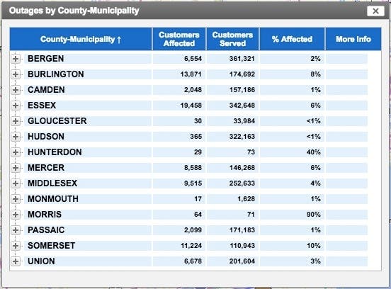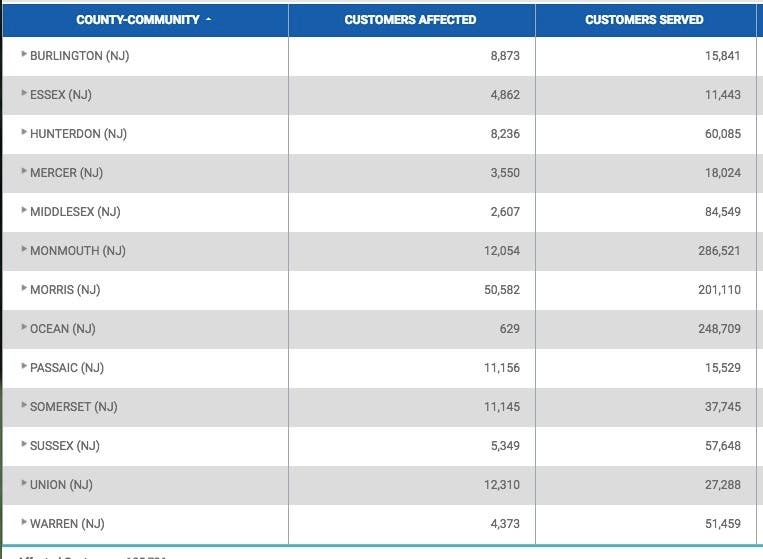 - Morris County: "At this time we cannot predict any additional impact this storm may have on electric service or ongoing restoration efforts, but significant snow accumulations will create additional outages and slow our work. Customers who have been out the longest are our top priority, and any new outages will be restored based on our storm process," JCP&L officials said. "We know this is extremely difficult, and we thank you all for your fortitude and support of our crews."