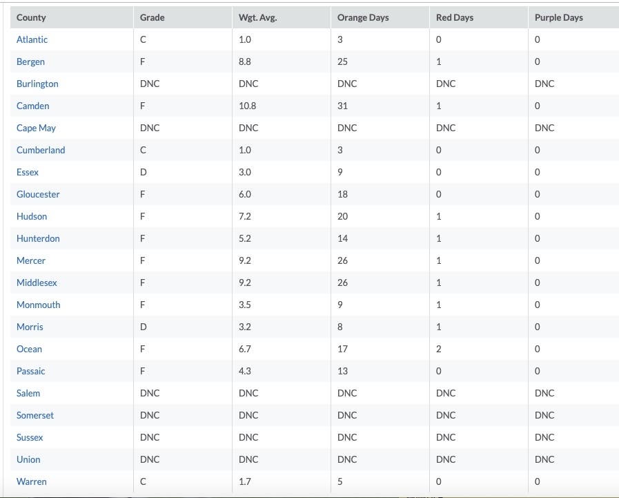 Here’s what the report found for New Jersey's 21 counties (DNC indicates that there is no monitor collecting data in the county):