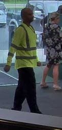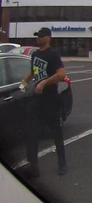He was wearing a black t-shirt and ball cap during the robbery at the Bank of America and a bright green shirt and no hat during the robbery at the TD Bank. The photo of the vehicle was captured during the robbery at the Bank of America.