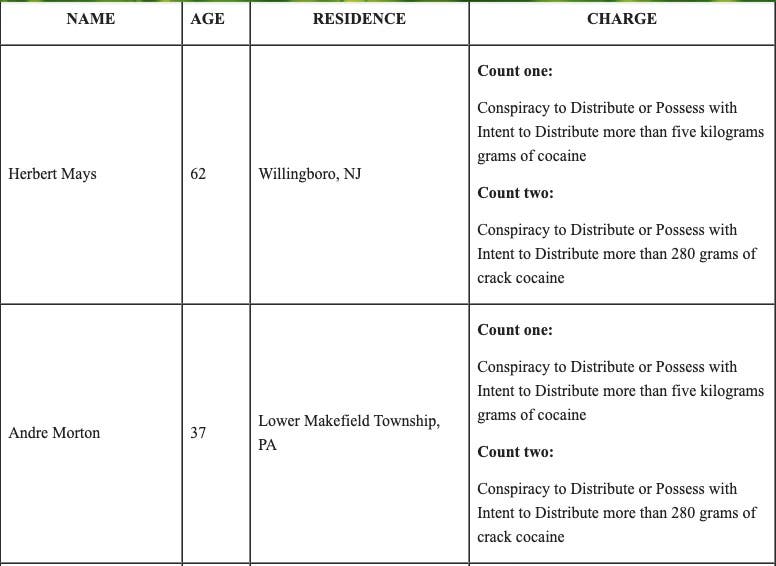The first complaint charges 20 defendants in two overlapping drug conspiracies involving the distribution of cocaine and crack cocaine. This organization is allegedly operated by Herbert Mays of Willingboro, according to the release.