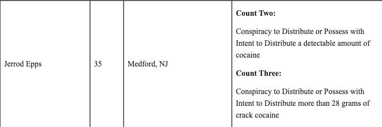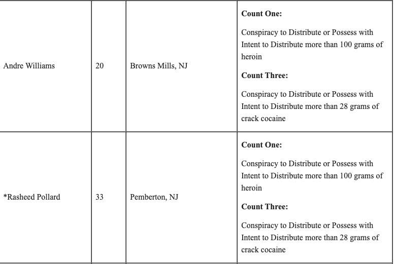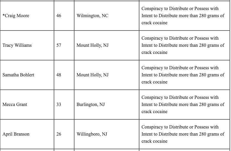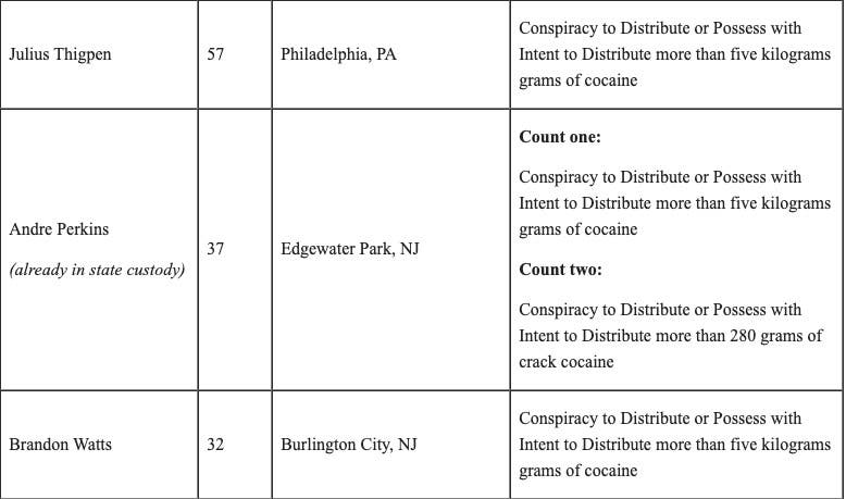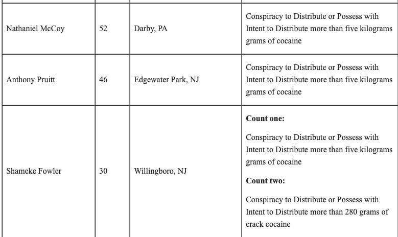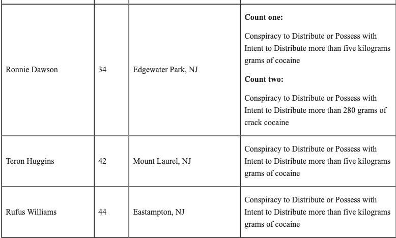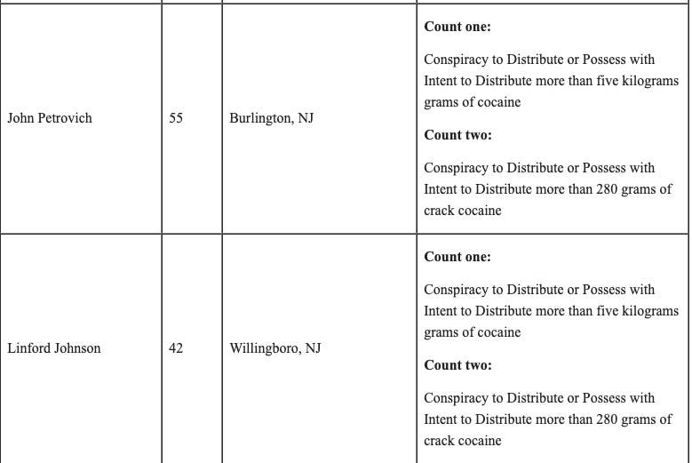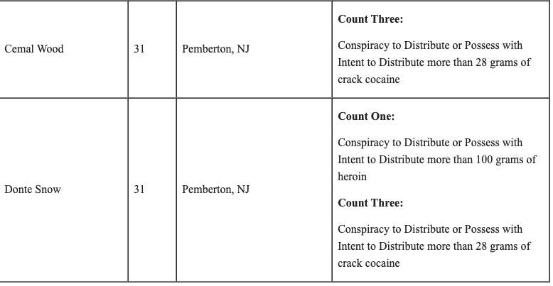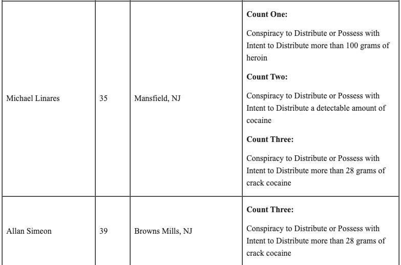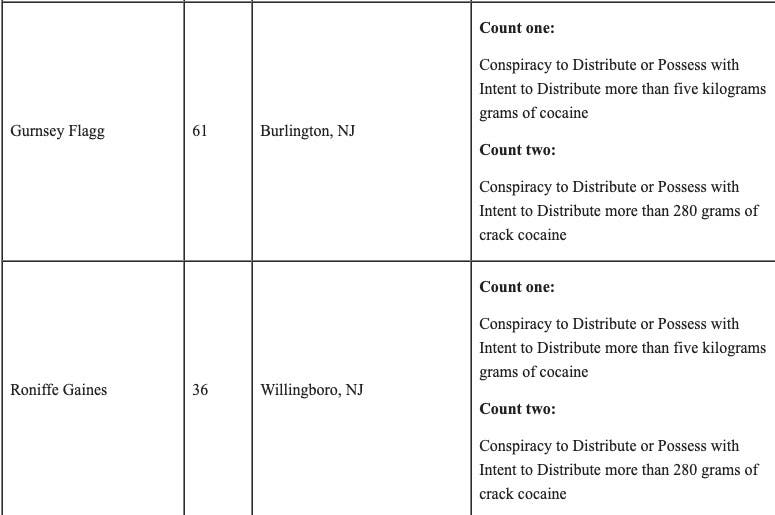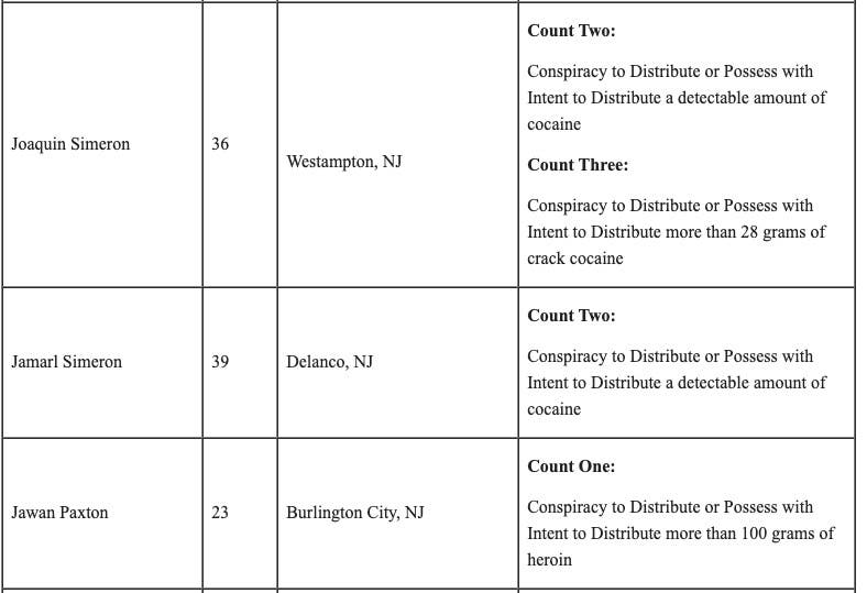 Between July 2019 and September 2019, the defendants and others engaged in multiple and overlapping narcotics conspiracies that operated primarily through at least seven New Jersey towns. They sought to profit from the distribution of cocaine, crack cocaine, and heroin in towns such as Willingboro, Burlington City, Burlington Township, Bordentown Township, Edgewater Park, Pemberton and Mount Laurel, according to the release.