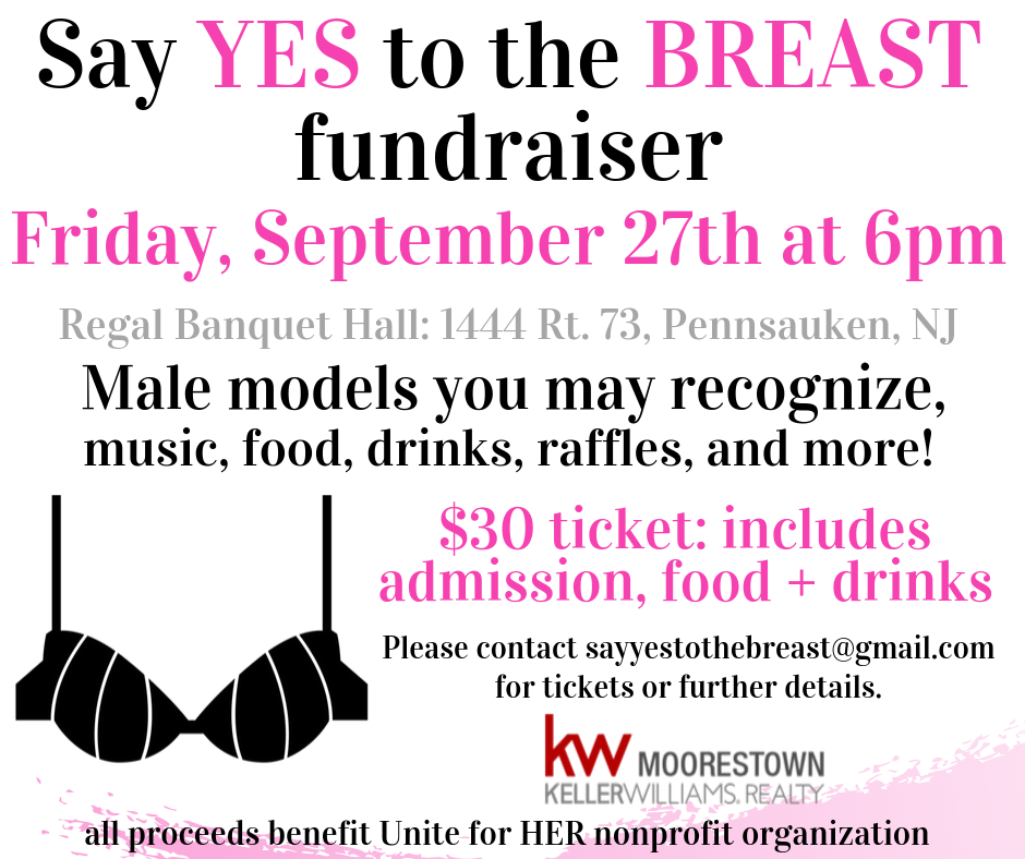 KW Moorestown presents the "Say Yes to the Breast!" fundraiser to support the Unite for HER nonprofit organization on Saturday, Sept. 27, 6 p.m. at Regal Banquet Hall, 1444 Route 73 north in Pennsauken.