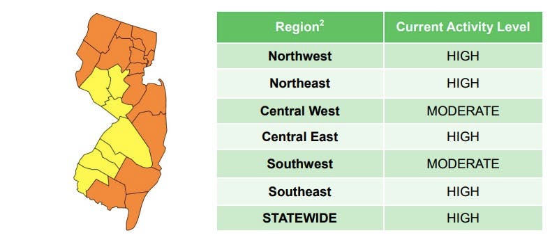 The latest reports say the overall coronavirus activity level is either "moderate," or "yellow," or "high," or "orange," in all New Jersey counties.