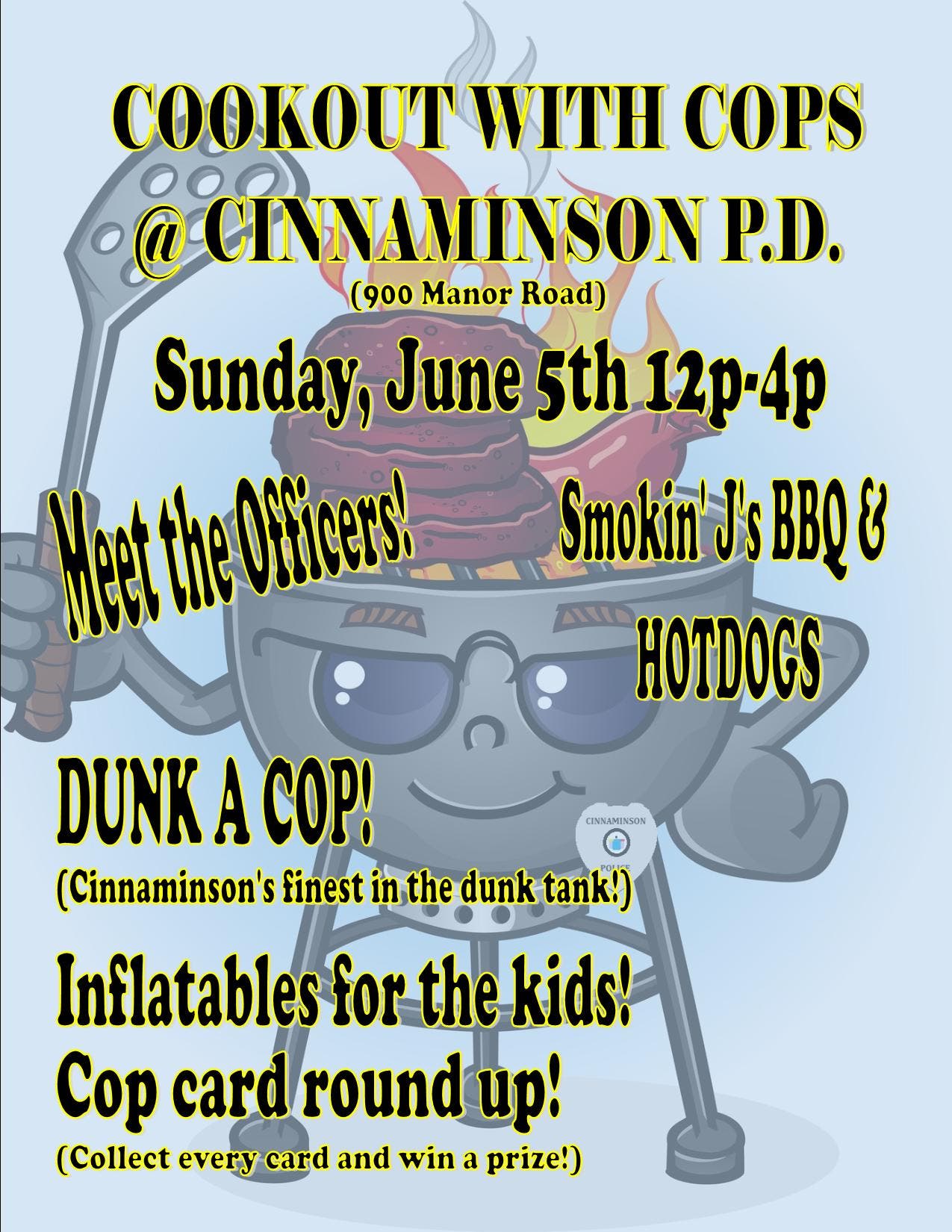Cinnaminson, NJ -- Cinnaminson Police will hold their annual Cookout With Cops on Sunday, June 5, noon-4 p.m. at 900 Manor Road.