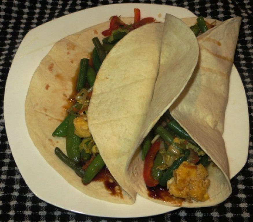 Heat a large skillet or wok over medium heat. Quickly scramble the egg, then remove to a plate and reserve. Clean the skillet or wok, and heat the toasted sesame oil and coconut oil over medium-high heat. Add the green beans, red bell pepper, cabbage, shredded carrots, mushrooms, scallions, snap peas, bean sprouts and garlic. Season with salt and toss, stir-frying for 2 minutes. Cover. Mix together the soy sauce, rice vinegar, mirin, and ginger. Uncover the vegetables, and add the sauce, tossing to mix well. Cook for an additional 1-2 minutes, until vegetables are tender. Add the reserved egg, tossing everything together, and remove from heat and transfer to a serving bowl. To serve, spread hoisin sauce down the middle of the warmed tortilla, and top with a generous amount of vegetable. Garnish with thai red chili sauce if desired.