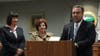 Union County Freeholders Christopher Hudak, Angel G. Estrada and Bette Jane Kowalski presented a resolution celebrating the library's 50 years to Natalie Belverio, president of the Clark Library Board of Trustees, at the celebration.