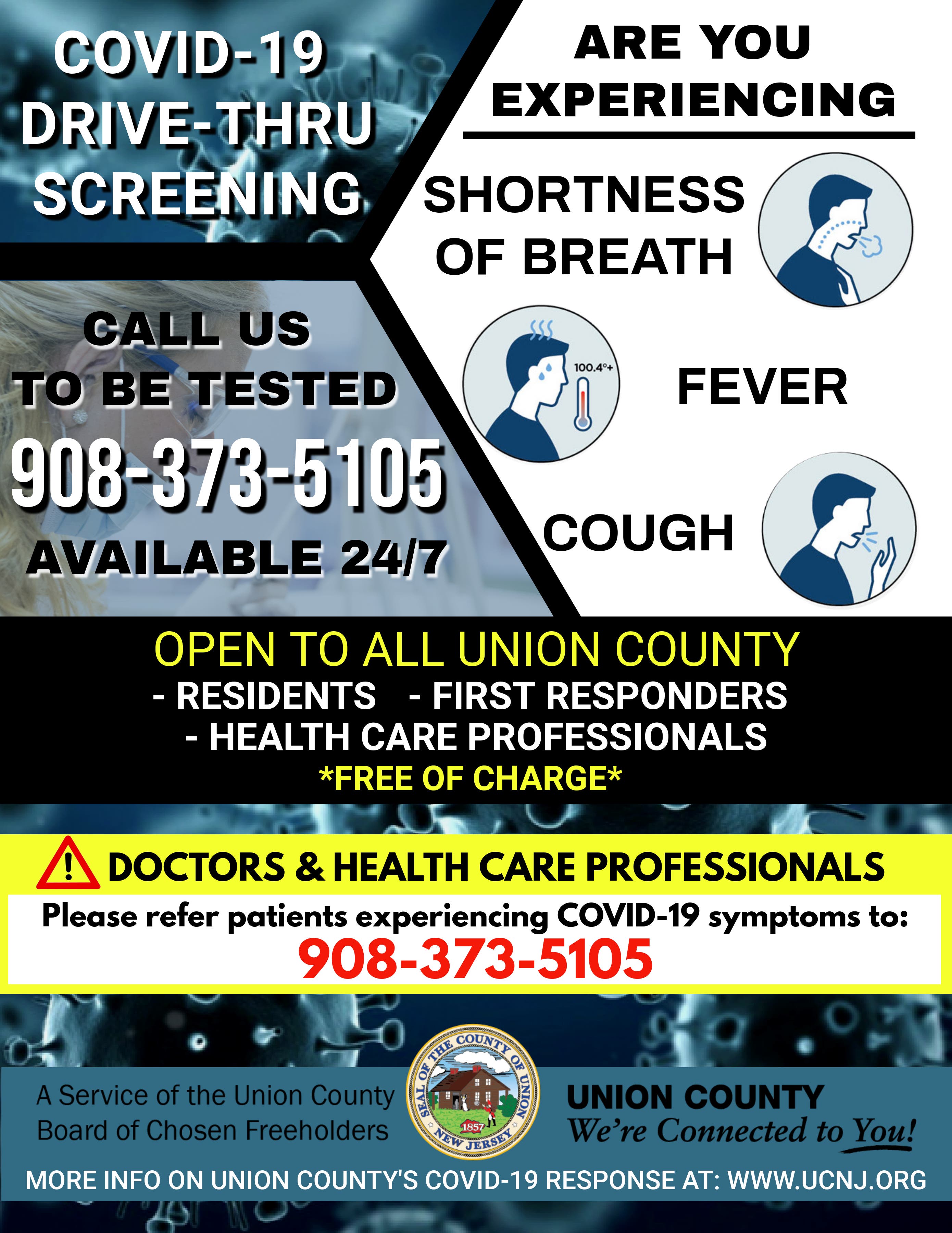 Beginning Monday, residents as well as all first responders and health workers working in Union County can report symptoms and schedule testing through a new "telehealth" procedure by calling 908-373-5105.