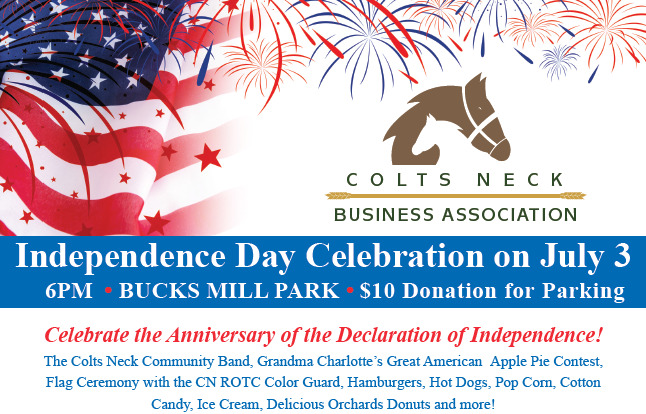 Celebrate the anniversary of the Declaration of Independence at the Colts Neck Business Association's Independence Day Celebration.