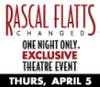 The next one will be the 'Rascal Flatts: Changed.' on Thursday, April 5 Superstar country music trio Rascal Flatts and AEG Live, in conjunction with NCM Fathom, will present a very special one-night-only theater event that will take place across the nation on Thursday, April 5 at 8:00 p.m (tape delayed). Rascal Flatts-CHANGED: One Night Exclusive Theater Event will deliver exclusive never-before-seen access into the lives of Gary LeVox, Joe Rooney, and Jay DeMarcus, along with exclusive performances of their biggest hits and music from their new album, CHANGED, set for release April 3 on Big Machine Records.