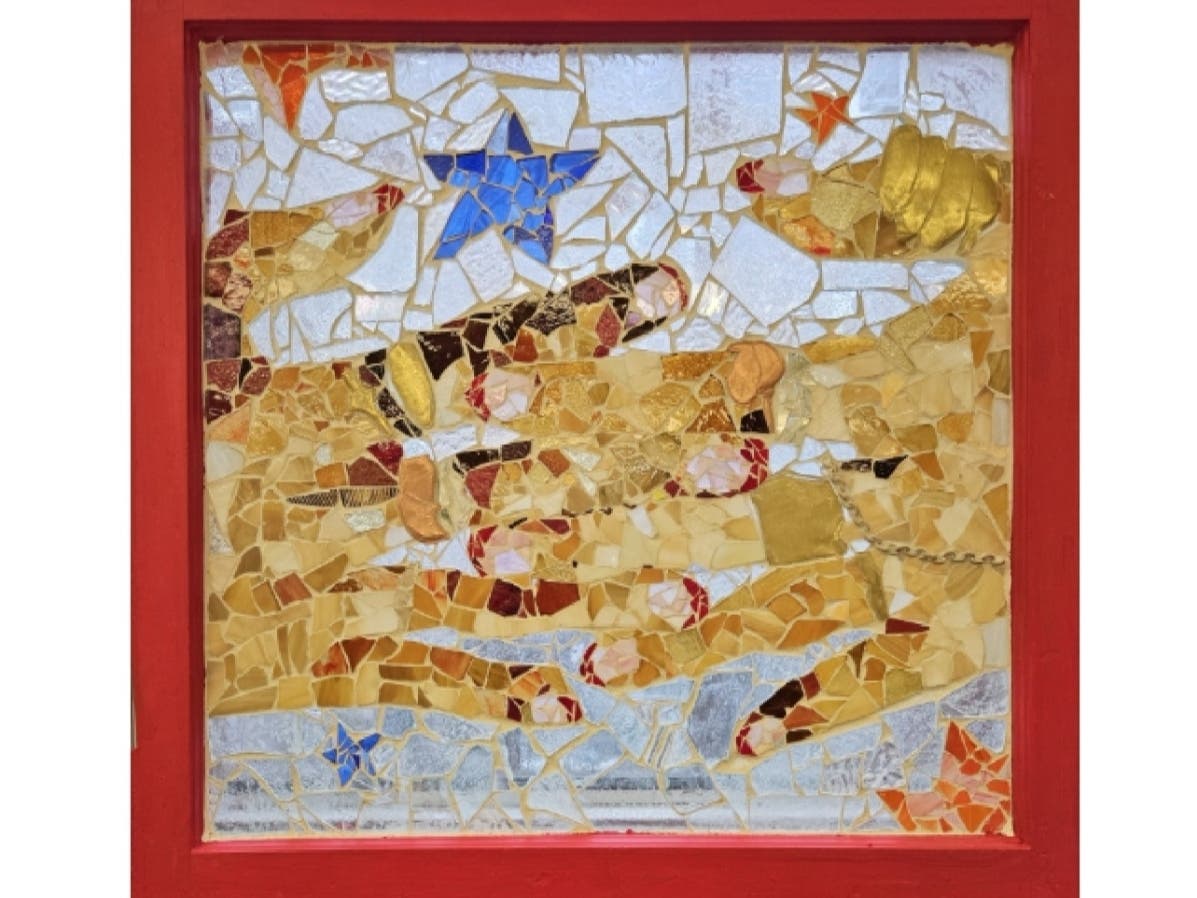 Her work combines stained glass, sheet metal, and chain links and will be on display from March 6 through May 10.