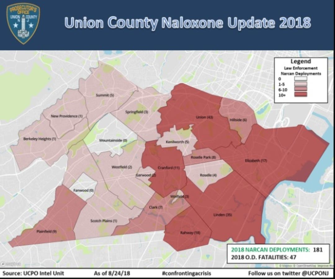The highest number of Narcan deployment remains in Union Township with 43, followed by Linden, Rahway, Elizabeth and Cranford.