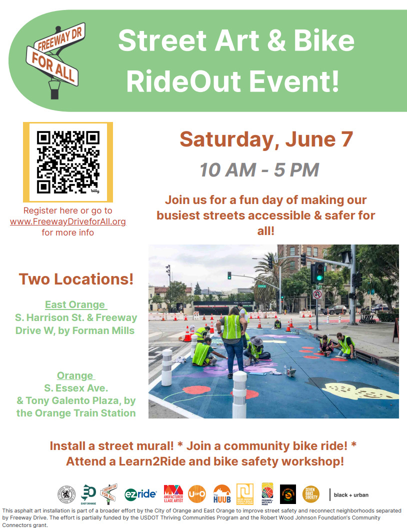 The Freeway Drive for All project team, led by the Cities of East Orange and Orange in collaboration with our local community partners, invites ALL RESIDENTS to join this fun Street Art & Bike RideOut Event—a day dedicated to making some of Essex County’s busiest streets safer and more accessible for all.