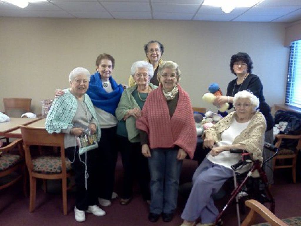 Since then they have been knitting for other causes as well. They have knit baby items for unwed mothers through Catholic Charities. The knitting club decided it would also be nice to help out their neighbors at the Stein Assisted Living, Jaffa Gate Memory Care Neighborhood. They just finished knitting several shawls for Jaffa Gate residents. They are always looking for other projects. Eleanor, the secretary of the group, expressed their desire to do something for the veterans who are coming home from Afghanistan and Iraq. They want to give back to those who have helped them and are currently exploring the possibility of knitting for the veterans at the one of the veteran’s hospitals in New Jersey. “We want to help the boys who are coming home.” They are also planning on contacting Stein Hospice in the near future to see if they are in need of their services.