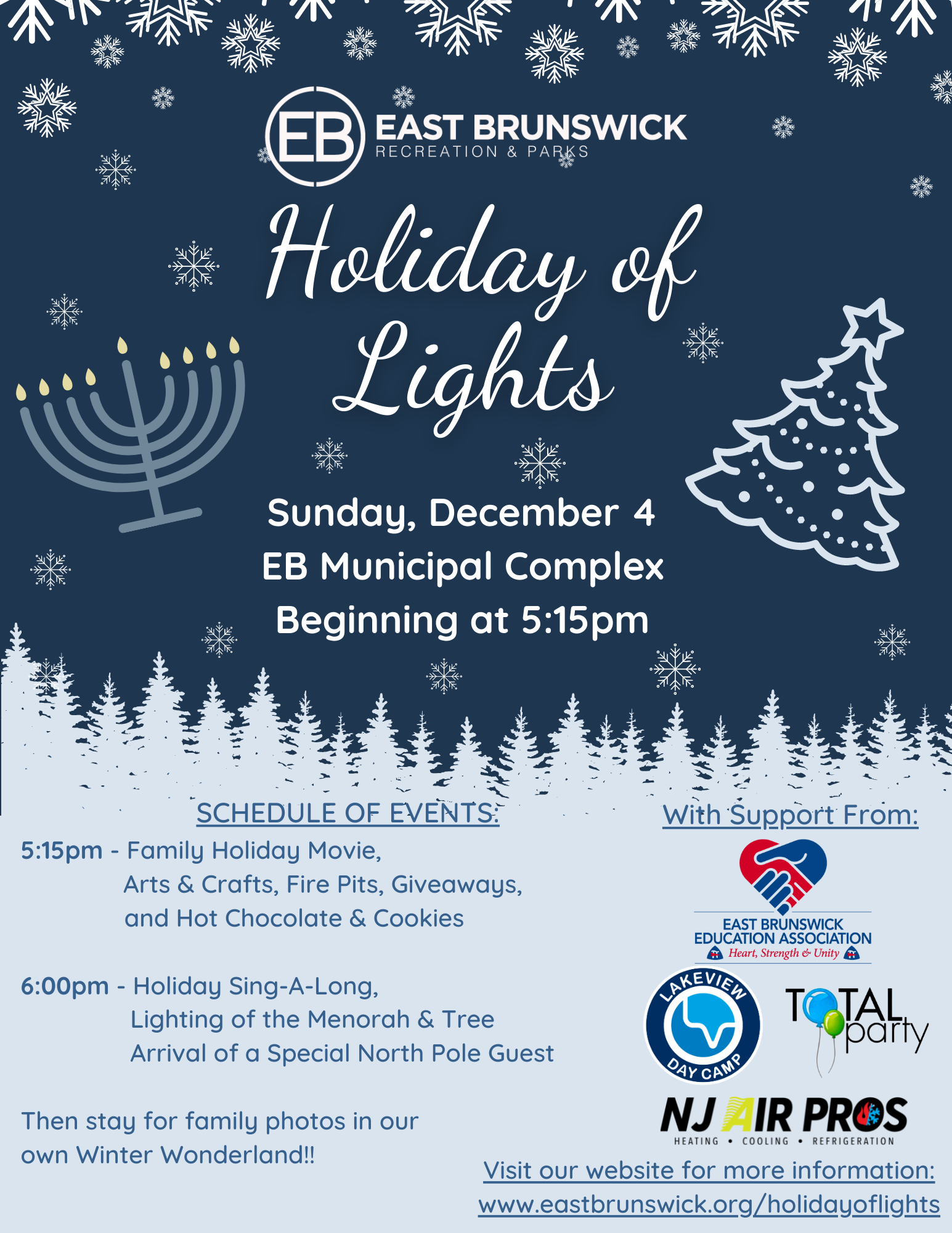 The Annual Holiday of Lights celebration will take place Sunday, 5:15 p.m. at the East Brunswick Municipal Complex.