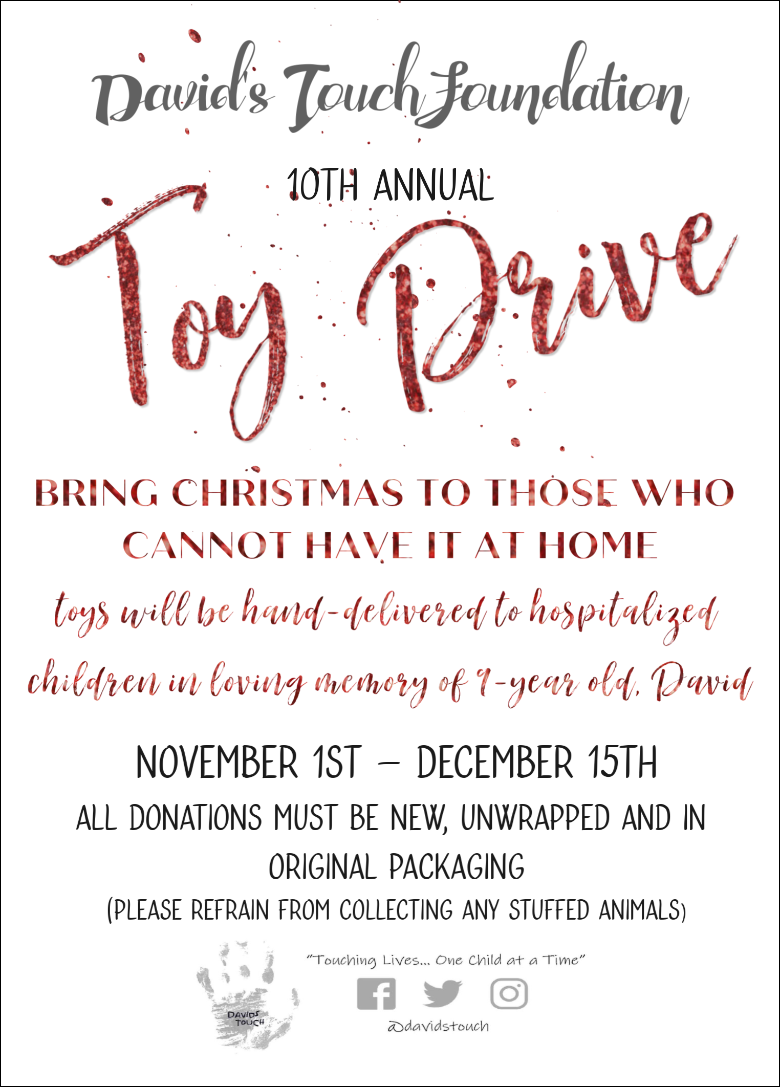 All toys will be hand delivered to hospitalized children that are unable to spend the holiday at home. Please consider joining us in donating to this worthy cause.