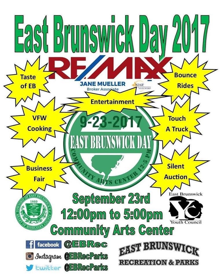 The annual community event will go from noon to 5 p.m. at the East Brunswick Community Arts Center at 715 Cranbury Road. There will be food carts from local restaurants, a free bouncy house, a silent auction, entertainment and kids can tour and ride a touch-a-truck fire truck. East Brunswick Day is sponsored by the local ReMax First Realty, the East Brunswick Youth Council and the East Brunswick Parks and Recreation Dept.
