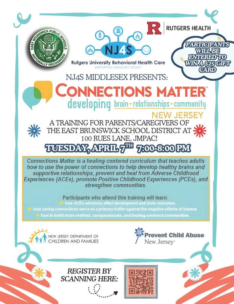 The event, hosted by East Brunswick Parent University in partnership with Rutgers University Behavioral Health Care, will feature the "Connections Matter" curriculum, a healing-centered program focused on developing healthy brains, supportive relationships and stronger communities.