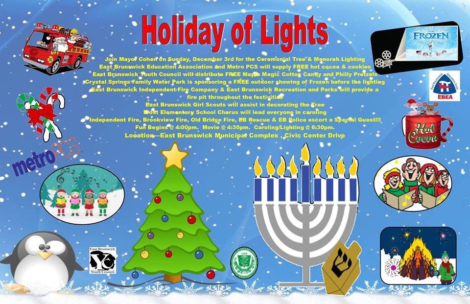 The event begins at 4 p.m. Dec. 3, the movie is shown at 4:30, caroling and lighting of the tree/menorah is at 6:30 p.m. It all takes place at the East Brunswick municipal complex, Civic Center Drive.