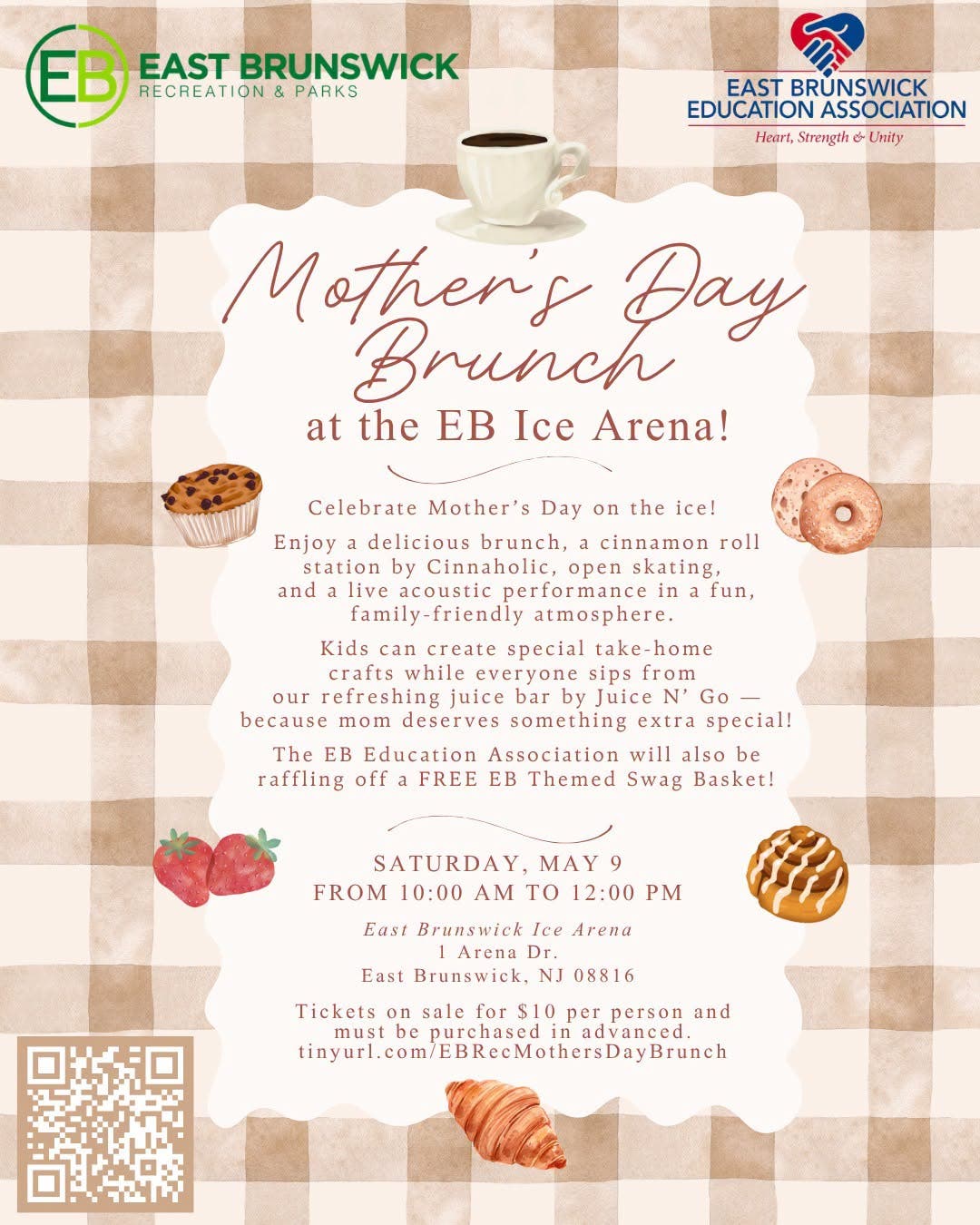 Tickets are $10 per person and must be purchased in advance at tinyurl.com/EBRecMothersDayBrunch or by scanning the QR code on the event flyer. Walk-ins will not be accommodated, organizers said, noting that last year's event sold out quickly.