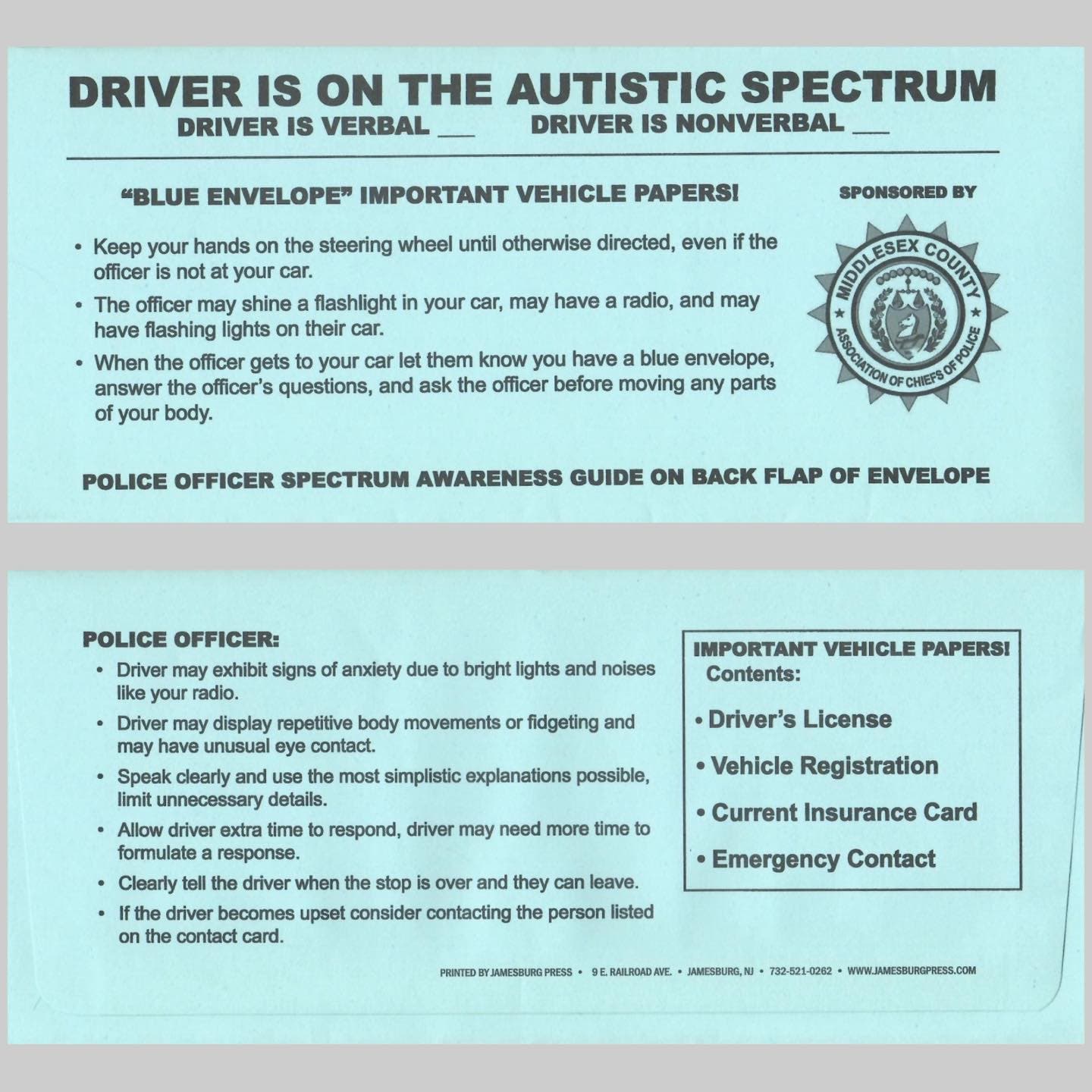 - Reducing anxiety: Traffic stops can be particularly stressful for autistic individuals. The blue envelope serves as a visual cue that helps officers adjust their communication style.
