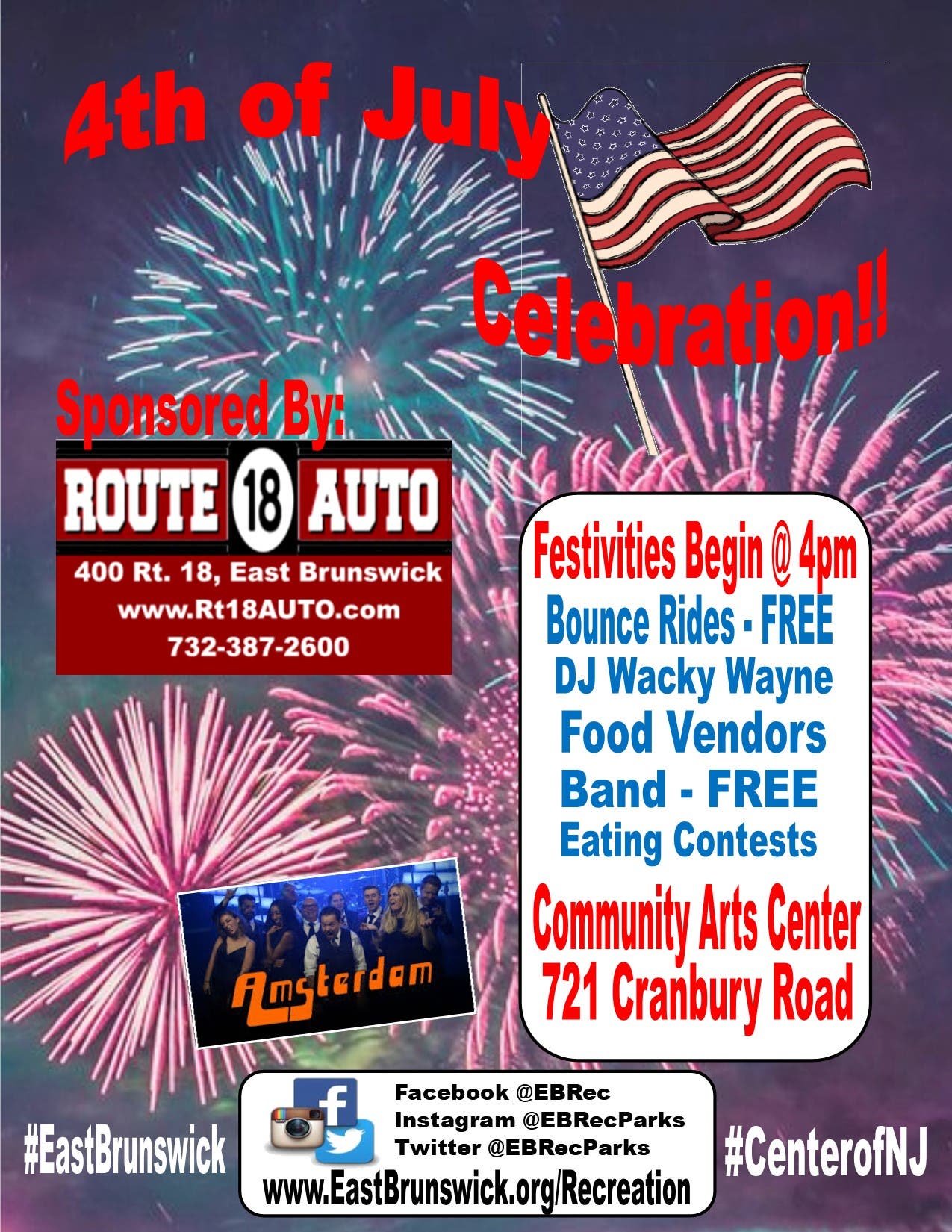 East Brunswick is ready to rock this July 4! The town already has their entire July 4, 2019 party planned: The event will go from 4-10 p.m. on Thursday, July 4 at the East Brunswick Community Arts Center, 721 Cranbury Road, East Brunswick, NJ (rain date July 5)