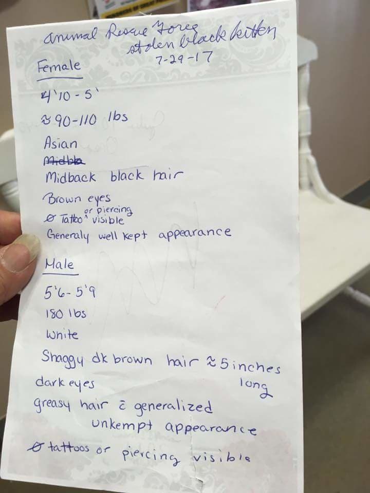 "One of our volunteers shouted that a second kitten was now missing from the cage. A family that was doing paperwork for an adoption said, 'Well, these people were just here and they just ran out.' That's when we knew it was them," she said.