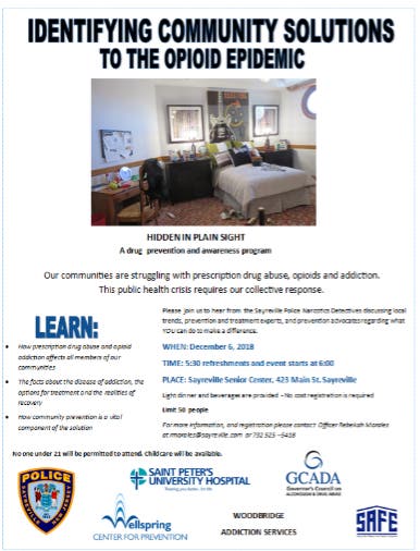 "Our community is struggling with prescription abuse, opioids and addiction," said Sayreville police in a statement. "Join us for free program tomorrow night."