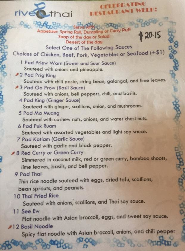 River Thai Restaurant (see their 2017 Restaurant Week menu below)
