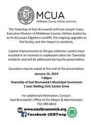 The Township of East Brunswick will host Joseph Cryan, Executive Director of Middlesex County Utilities Authority, as he discusses Edgeboro Landfill, the ongoing upgrades to the facility, and the impact to residents.