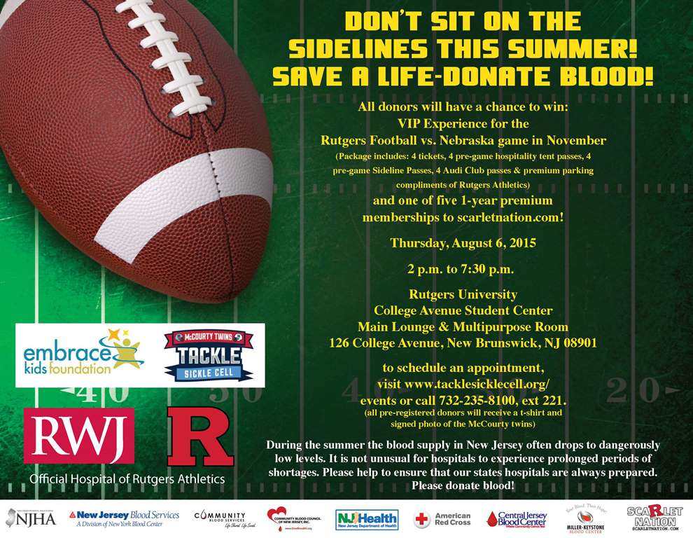 “Our partnership with Rutgers University for this event gives us access to a broader donor pool while building upon our success partnering with the Tackle Sickle Cell campaign and Embrace Kids Foundation,” Wells added. “The generous raffle prizes that Rutgers Athletics, Embrace Kids and ScarletNation.com have provided for Aug. 6 Blood Drive donors are outstanding and hopefully will motivate many to consider making a potentially life-saving donation.”