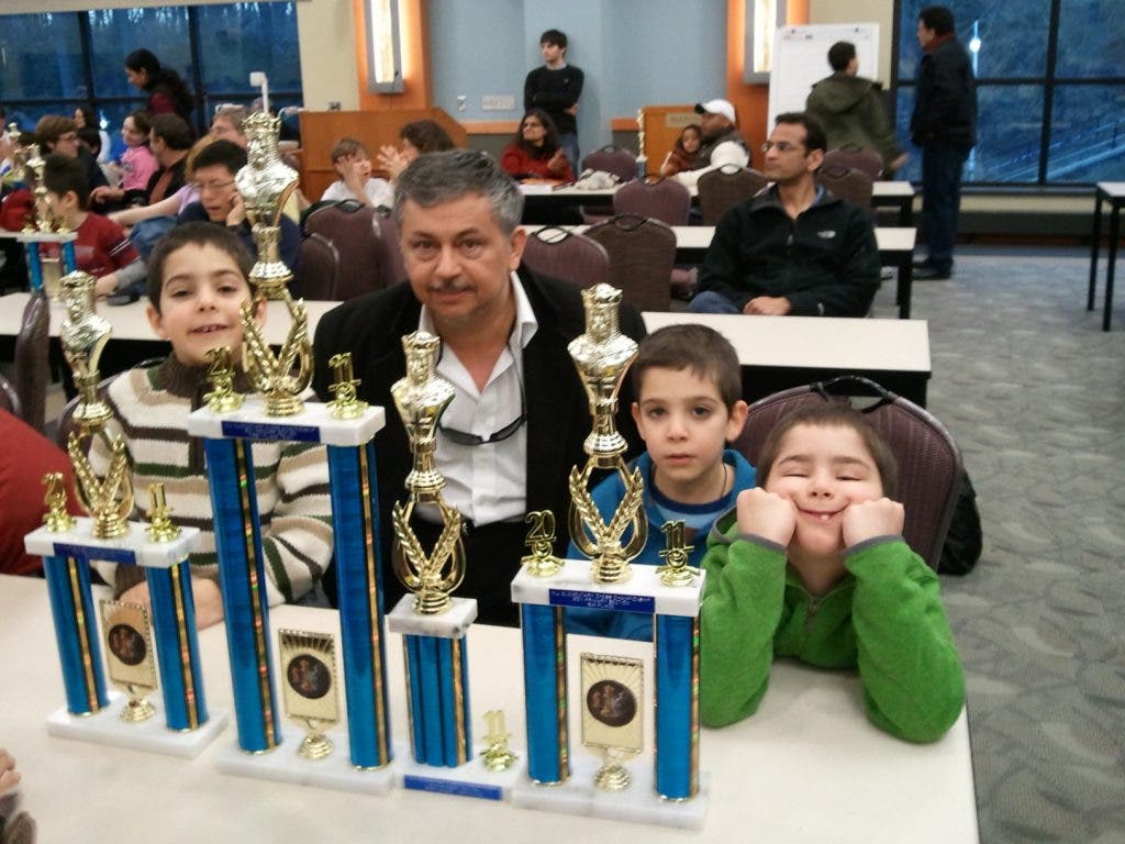 The Oskipers also earned individual trophies, with Andreas coming in sixth and Costas eighth among all K-3 players—98 chidlren altogether—while Nicholas took fourth place among first-graders. (The data is here, though it doesn’t take into account tiebreaking matches, which had an effect on the boys’ finishing places.)