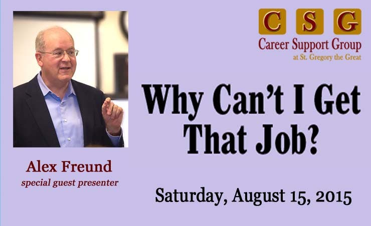 August 15, 2015 at 8:30 a.m., one of the area’s top career coaches, Alex Freund, will present “Why Can’t I Get That Job?” at the Career Support Group’s monthly meeting this Saturday. This special presentation covers various details focusing on the interview for example, the importance of the “fit factor.” During the session, you will learn: