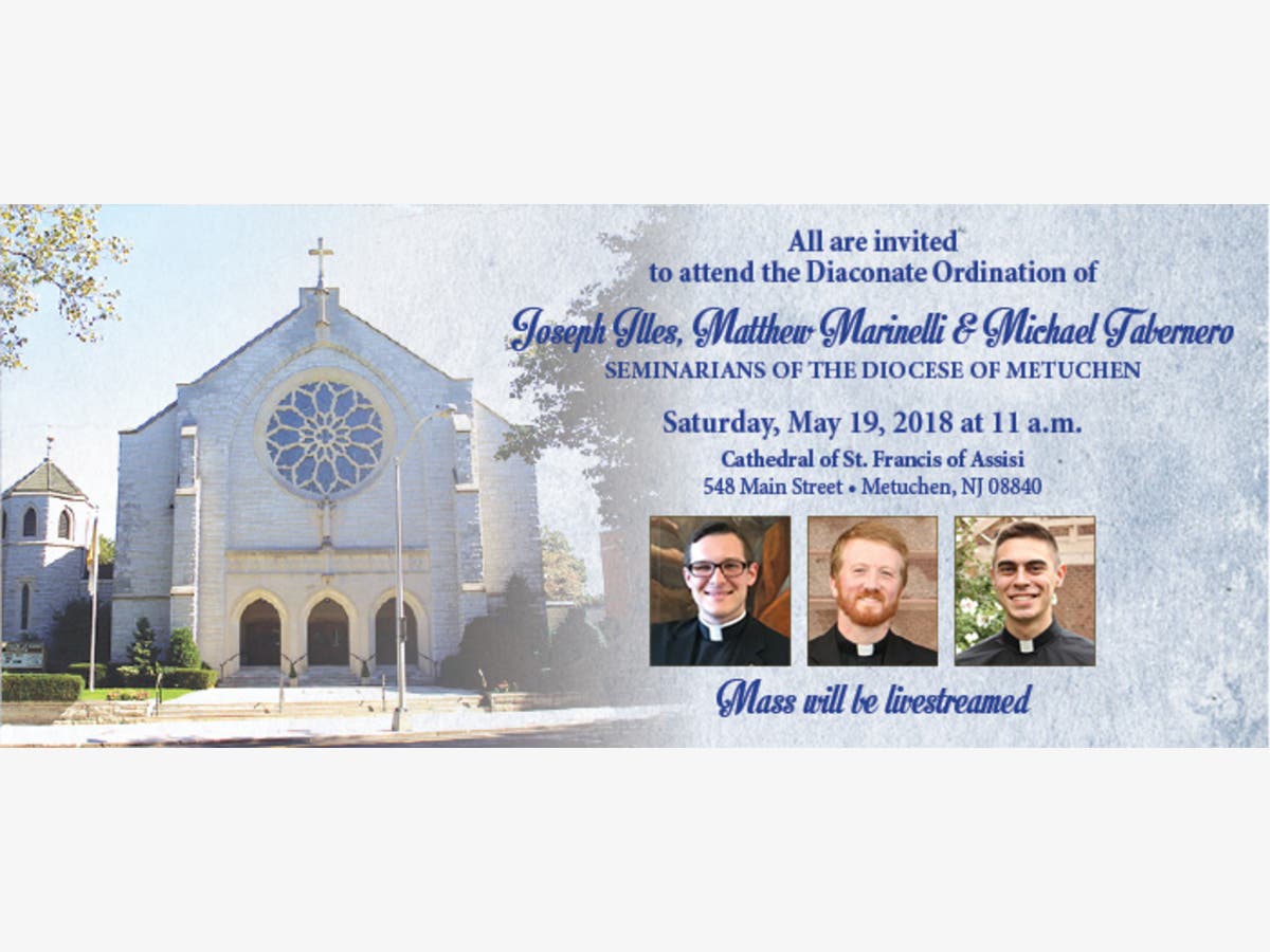 Bishop James F. Checchio to ordain three men, all natives of the Diocese of Metuchen whom are preparing for eventual service in the priest