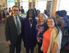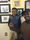 Pictures: Raymond Romney and his son, Raymond Romney, Jr., pose next to Romney Jr.,'s watercolor peacock painting. Also, from left: Superintendent Robert L. Kravitz, Principal Daniela Small-Bailey, and teachers Alicia Kays and Nina Leahy at the reception. Courtesy of Englewood Schools
