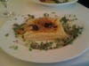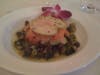 I elected to go with two small plates for an entrée –a smoked salmon napoleon with goat cheese, red onion, cucumber and caper dressing and a “French pizza” which turned out to be puff pastry topped with olives, carmelized onions and anchovies.