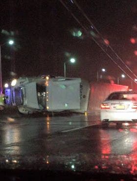 FORT LEE, NJ - High winds caused a semi-trailer truck to flip over on the upper level of the George Washington Bridge Wednesday night, police said.