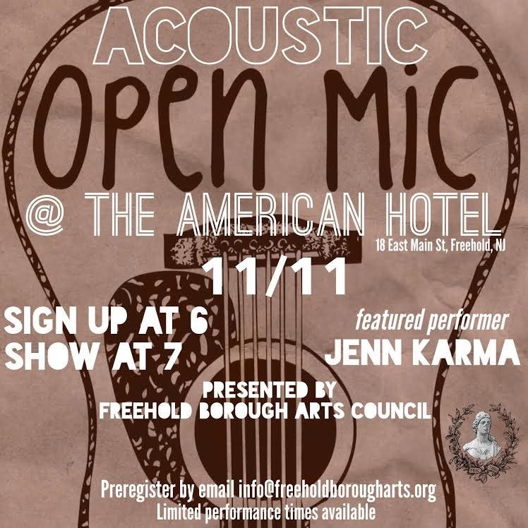 The Freehold Borough Arts Council is pleased to announce its first Acoustic Open Mic Night to be held at the beautiful American Hotel, located at 18 East Main Street, Freehold, NJ, on November 11, 2014. Sign up for musicians begins at 6pm and the show starts at 7pm. The American Hotel will open up the banquet room nearest the lounge area for the event.