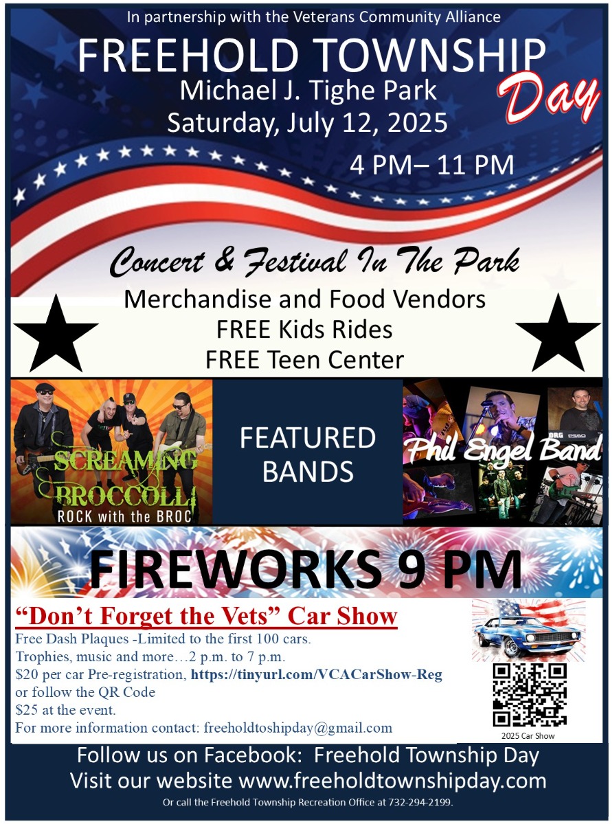 Fireworks are set to begin at 9 p.m. To learn more, you can visit the Freehold Township Day Facebook page or website.