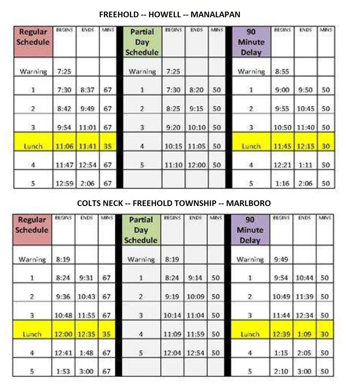 A winter storm prompted the announcement for Colts Neck, Freehold, Freehold Township, Howell, Marlboro, and Manalapan. See the schedules.