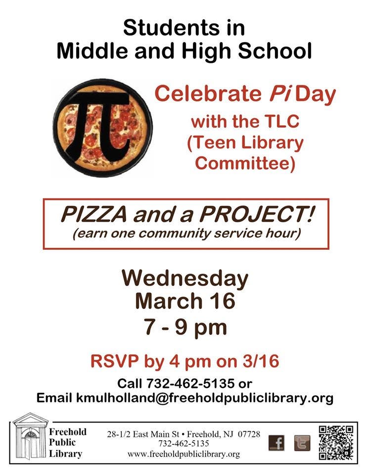 Students 6th - 12th grade! Celebrate “Pi Day” with pizza and a service project at Freehold Public Library.